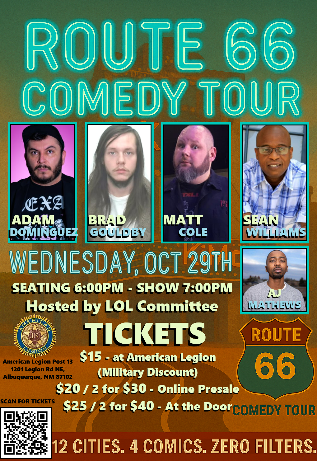 | Wed, Oct 29 | Albuquerque, NM | American Legion #13 | Doors 6:00 PM | Show 7:00 PM | Buy |